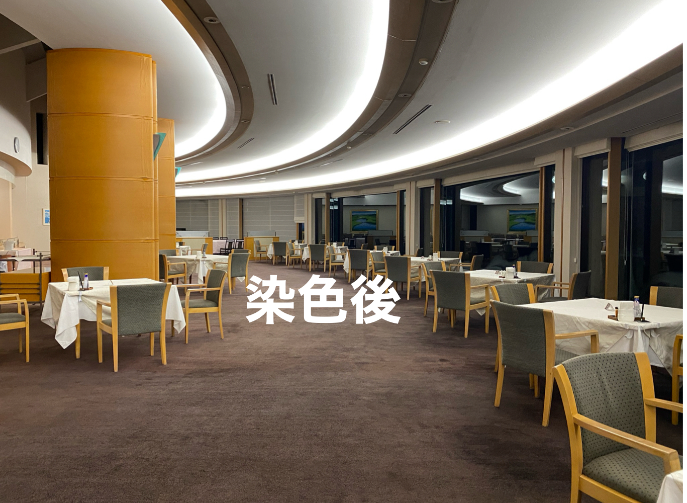 ホテルやゴルフ場などの⾊褪せたカーペット・絨毯。張り替える費⽤の約4分の1の費⽤で、しかも短納期に、独⾃の染⾊⼯法にて⾊鮮やかに甦らせます。