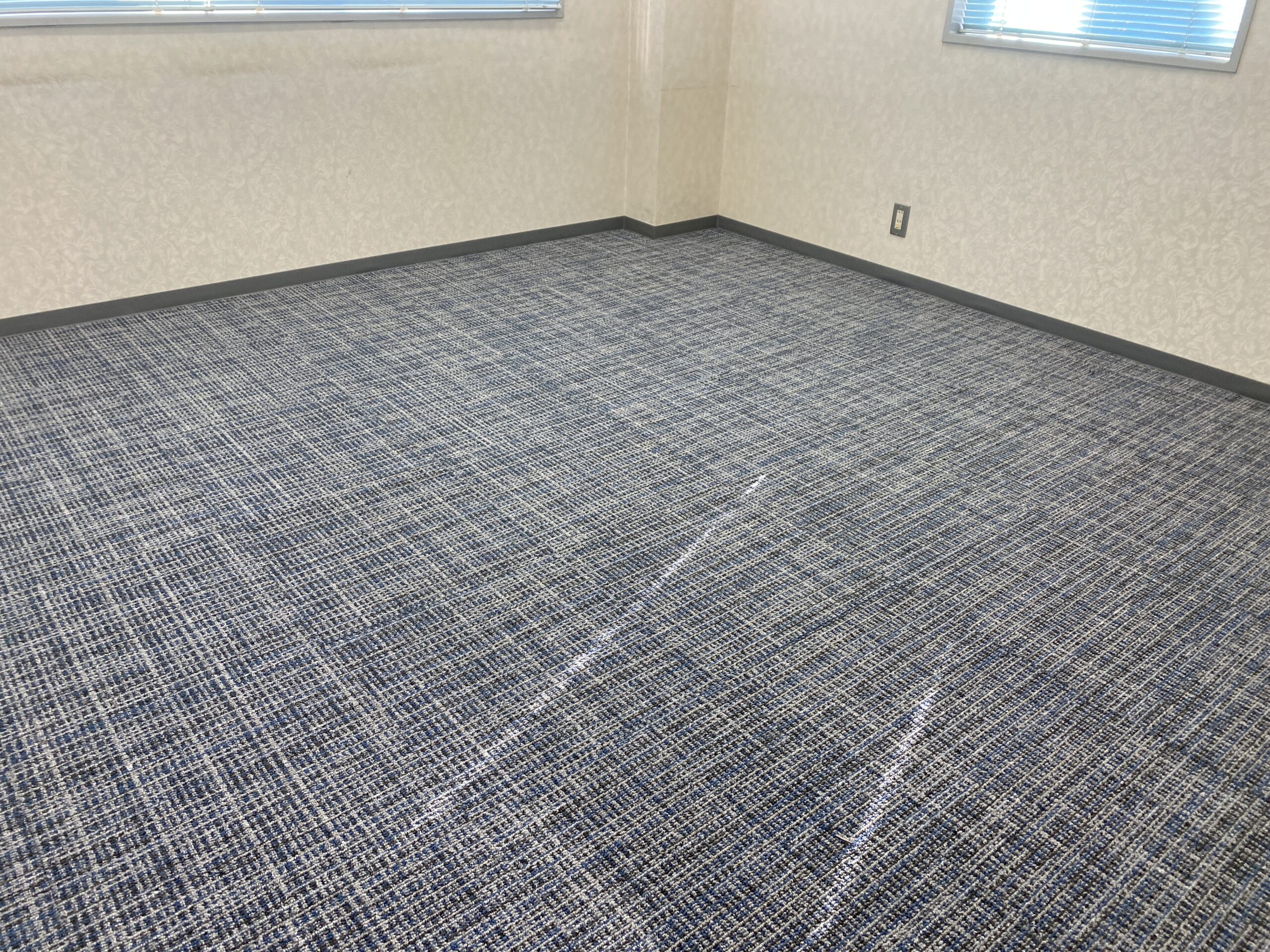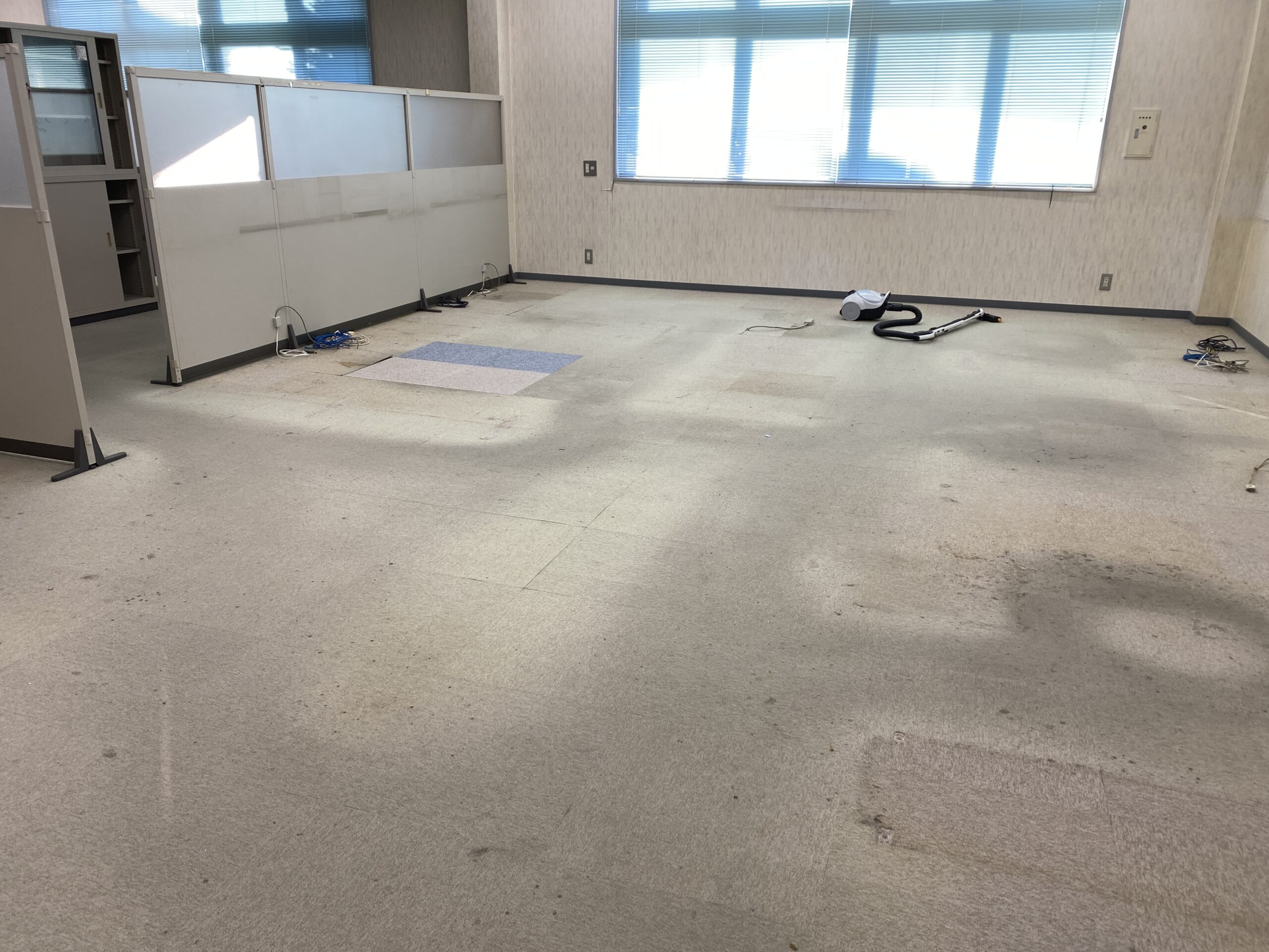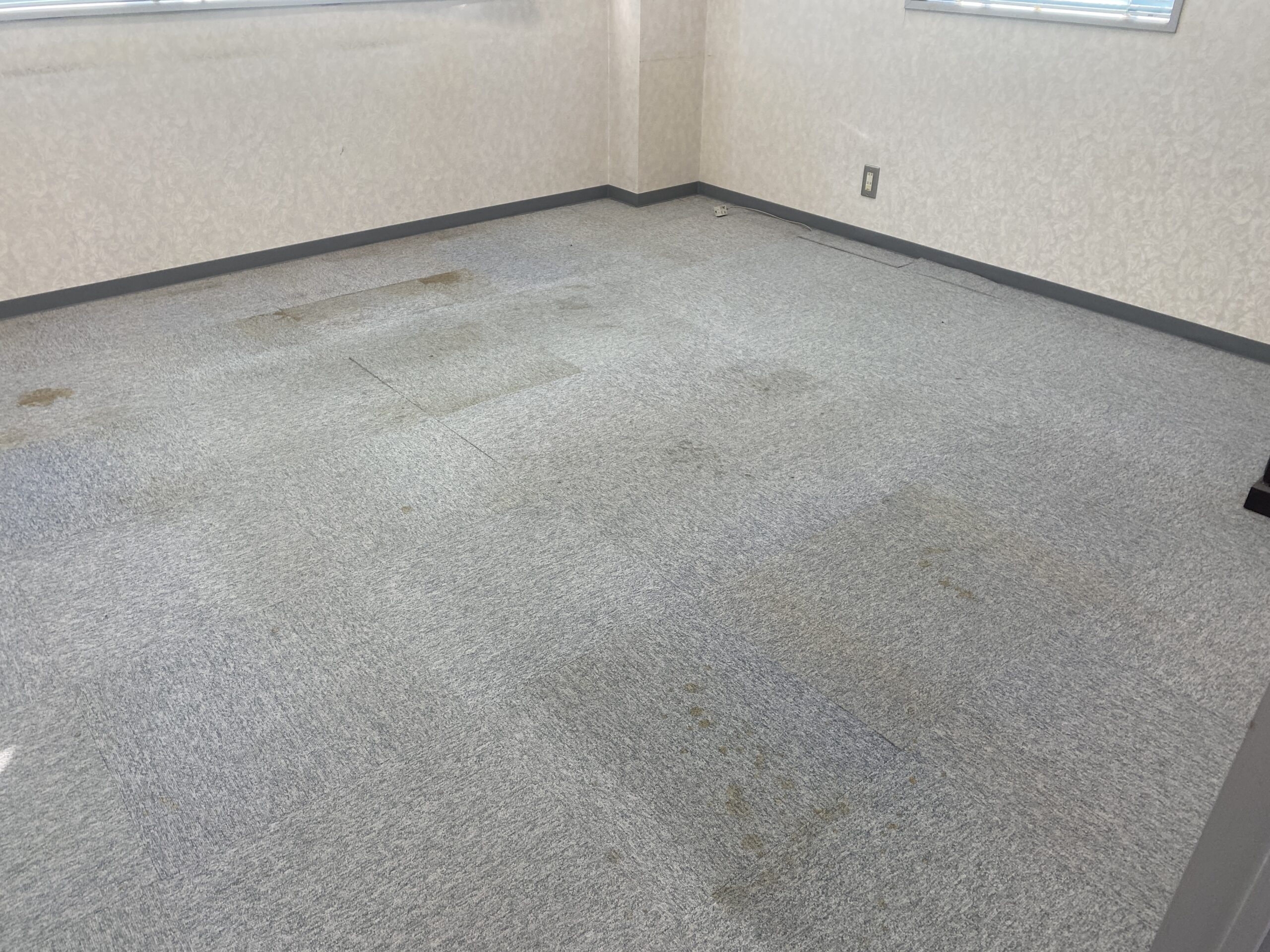 テナント事務所のタイルカーペット張替えを行わせて頂きました。事務所の床はOAフロアとコンクリートの両立という珍しいでした。施工させて頂いたタイルカーペットはサンゲツ製のNT350シリーズからドロップチェックNT-31505という少し青みがかったカーペットです。新しく机や椅子が入ってくる前に施工を完了したいという事で急ぎタイルカーペットを施工。弊社では専門知識を持ってカーペットを施工していきますのでカーペットの材質やご予算に応じてご提案可能です。デザインカーペットなどのご要望にもお応えできますので、カーペットを張り替えたいけど、どれがいいのかわからない方は一度ご相談ください。